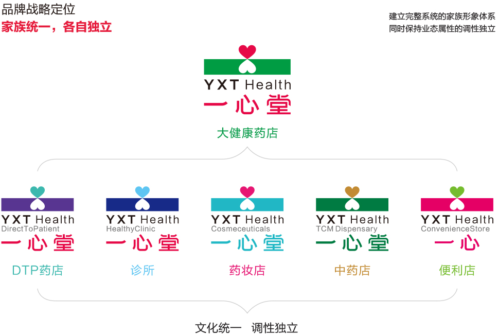 一心堂未來(lái)是要構(gòu)建多業(yè)態(tài)大健康產(chǎn)業(yè)鏈的,集團(tuán)旗下會(huì)有很多業(yè)態(tài),那么怎么才能先通過(guò)品牌外在形象實(shí)現(xiàn)一開(kāi)始定下的“家族統(tǒng)一,業(yè)態(tài)獨(dú)立”的品牌戰(zhàn)略定位呢?