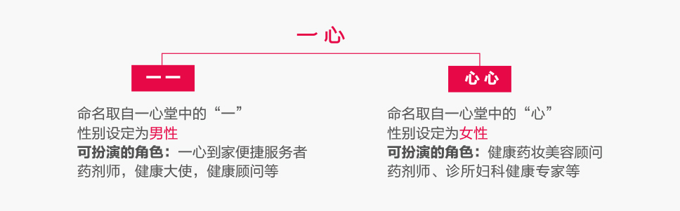 “一一”和“心心”一個(gè)對(duì)內(nèi),一個(gè)對(duì)外,共同代表一心。性別屬性的建立能更好滿足顧客需求,強(qiáng)化溝通,快速獲取顧客信任。他們共同作為一心堂企業(yè)發(fā)展的形象宣傳大使,共同表達(dá)著一心堂的核心價(jià)值觀,最終實(shí)現(xiàn)一心堂共同的價(jià)值取向。