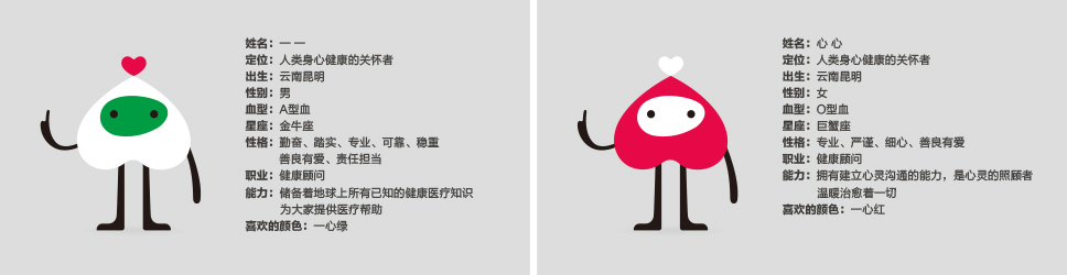 比如在診所里用藥店的顏色,那是不搭調(diào)的,所以要去配合品牌進(jìn)行調(diào)整。他們的形象不變,名字不變,他們永遠(yuǎn)是“一一”和“心心”,只是身上的顏色(衣服)發(fā)生了變化。