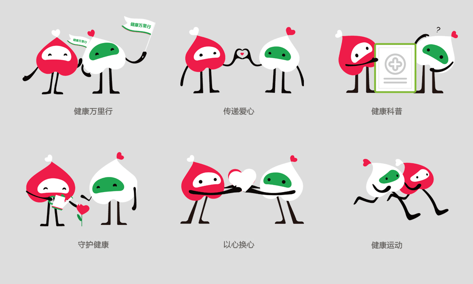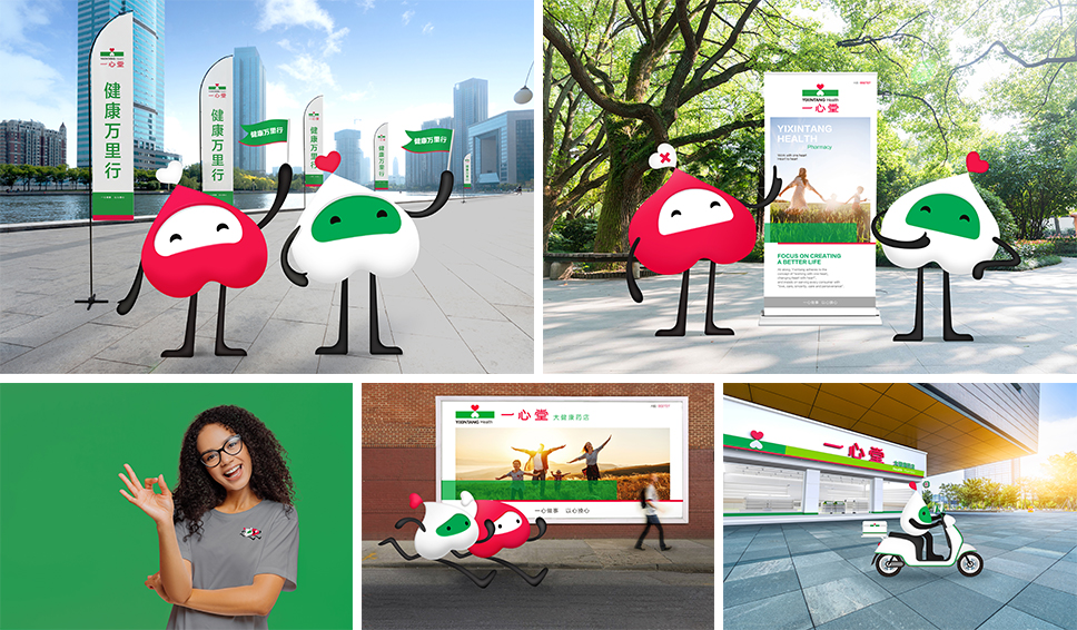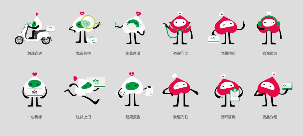 將取自標(biāo)志中的紅心和白心共同作為品牌價(jià)值擬人化的載體,嫁接標(biāo)志中所體現(xiàn)的一心堂的文化與價(jià)值觀 ,共同承載著心文化。靈活的的身份轉(zhuǎn)變,也可以在線下進(jìn)行用戶互動(dòng),輕松參與到各類營(yíng)銷活動(dòng)中。