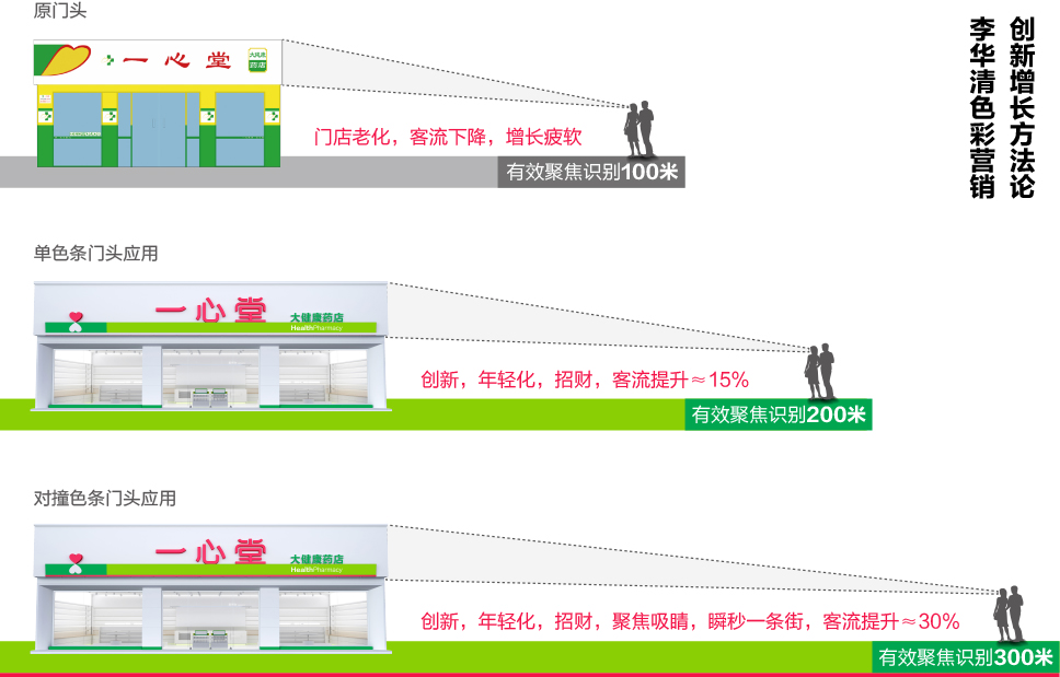 讓整條街道都能看到一心堂,實(shí)現(xiàn)焦點(diǎn)引流。李華清色彩營(yíng)銷就具有這樣的魅力。