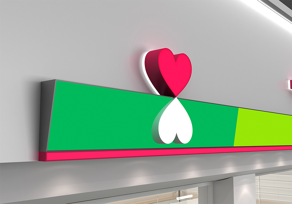 在云南,一心堂明亮的綠色早就融入了百姓的生活。雖然消費(fèi)者與員工都覺(jué)得現(xiàn)在的色彩沉悶而壓抑,但門店中應(yīng)用的綠色和紅色的品牌名稱,已經(jīng)形成了品牌的資產(chǎn),是消費(fèi)者對(duì)一心堂的印象與最大辨識(shí)點(diǎn)。于是我們決定保留這一份情懷與認(rèn)知,在門頭依舊使用綠色和紅色,同時(shí)放大品牌名稱。讓老顧客不感到陌生,能迅速識(shí)別,讓新顧客看到,走進(jìn)門店。