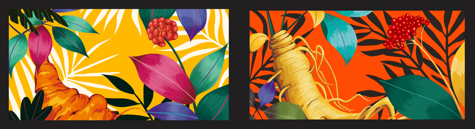 李華清項目團隊翻閱了各種文化書籍,從《聆聽漢畫》中找到了靈感,發(fā)現(xiàn)漢畫的風(fēng)格大多都是浪漫渾樸,擴大豪放的風(fēng)格,我們學(xué)習(xí)上面的繪制技巧和表現(xiàn)方法:畫面四周黑色邊框,猶如漢代歷史的大門,將我們帶入春天的百草園,去窺探神秘百草園的生長意境,感受撲面而來的自然芳香的本草氣息。