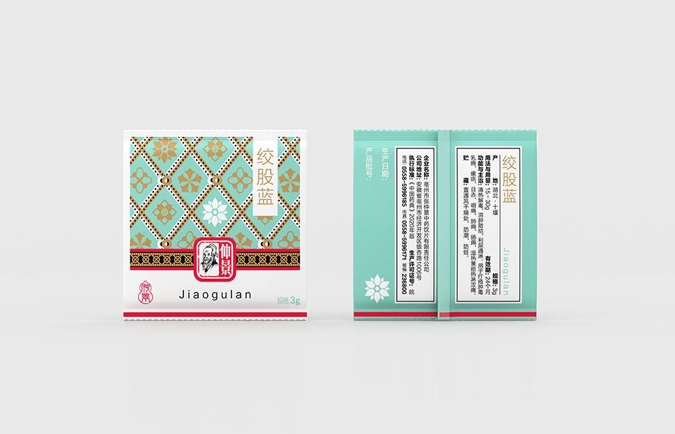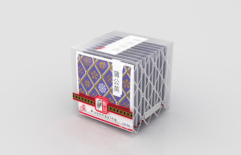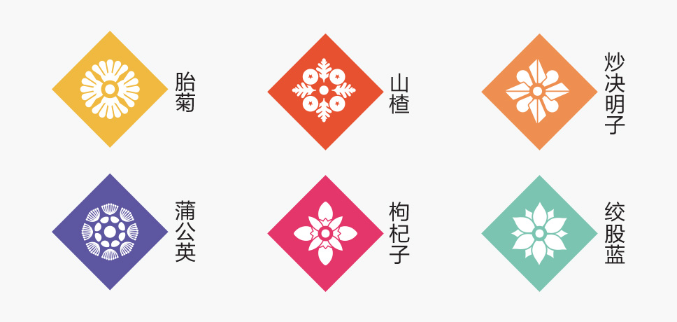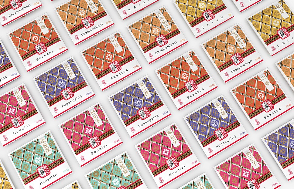 李華清項目團隊在市場走訪中看到了中醫(yī)抓方配伍的場景,由此產(chǎn)生了靈感的聯(lián)想。我們運用方勝紋與十字穿環(huán)紋結(jié)合衍生出抓方配伍場景凌霄花、茱萸花、柿蒂紋與產(chǎn)品進(jìn)行搭配,實現(xiàn)君臣佐使,和諧配伍。通過簡單有序的元素排列,形成專屬的仲景花茶戰(zhàn)略元素。
